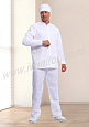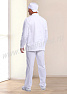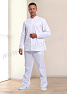 Костюм мужской состоит из куртки и брюк. Куртка удлиненная прямого силуэта с центральной потайной супатной застежкой на кнопки. Полочки с отрезными кокетками, спинка со средним швом. Рукав втачной длинный, прилегание рукава по низу регулируется кнопками. Воротник-стойка обеспечивает изоляцию кожных покровов в области шеи. В боковых швах куртки предусмотрены разрезы для легкого доступа в карманы брюк. Брюки прямые на эластичном поясе с верхними боковыми карманами с наклонным входом. Костюм предназначен для защиты от общих производственных загрязнений. Модель разработана в соответствии с международными требованиями безопасности пищевого производства согласно системе НАССР (ХАССП).
